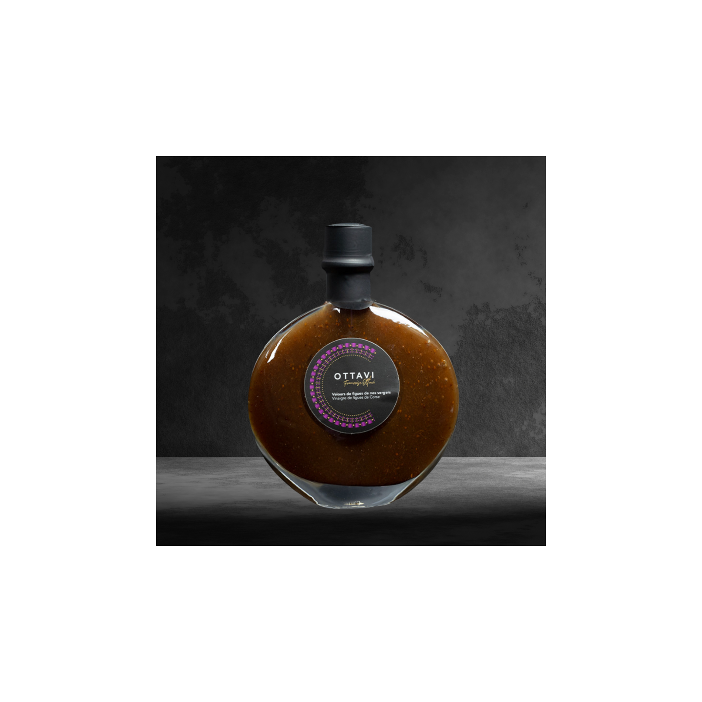Vinaigre de figues issues des vergers familiaux. Onctueux et spiritueux aux arômes subtils. Fruité et peu sucré, ce nectar déglacera volontiers le foie gras, les volailles... idéal aussi en salade. Les figues sont ramassées à pleine maturité.